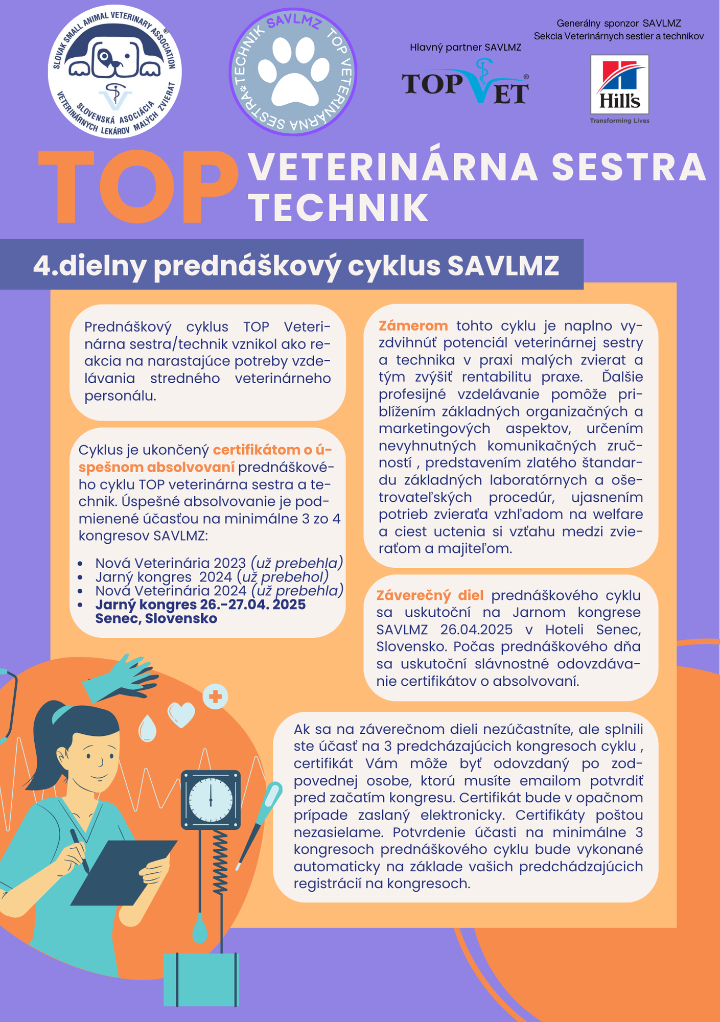 Zároveň ide o posledný diel prednáškového cyklu TOP Veterinárna sestra/technik . Pre viac informácii kliknite sem.